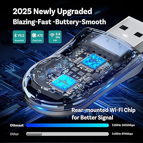 Compatible with over 600 car models, the Ottocast Mini delivers ultra-fast, stable connections thanks to its dual-band 2.4GHz & 5GHz WiFi technology. Setup is quick and easy: just plug the adapter into your car’s USB port, connect via Bluetooth once, and it will automatically connect every time you start your vehicle.